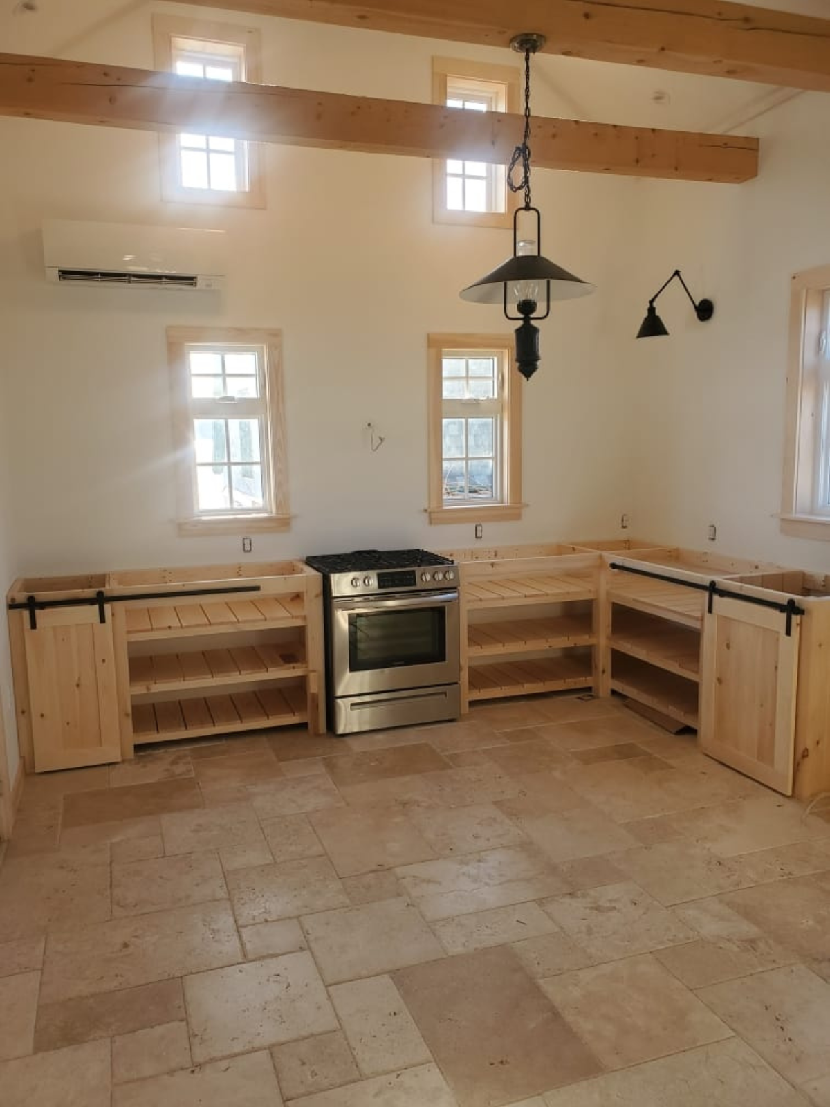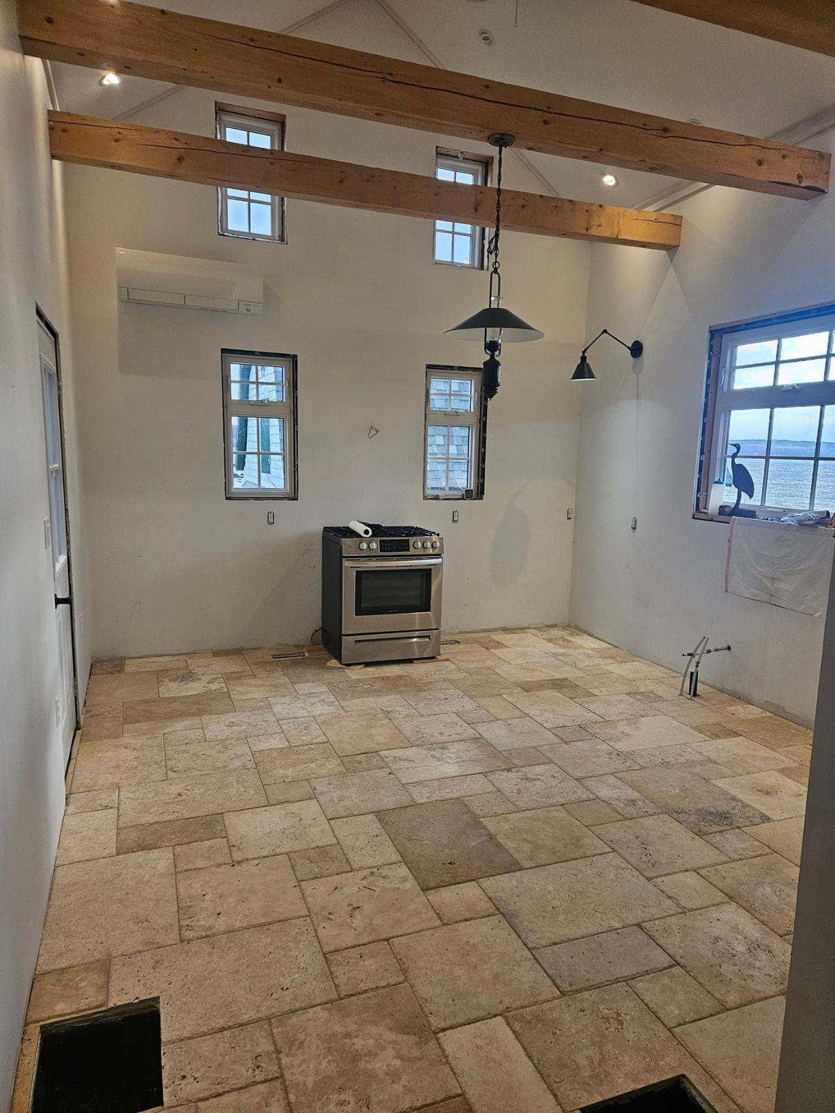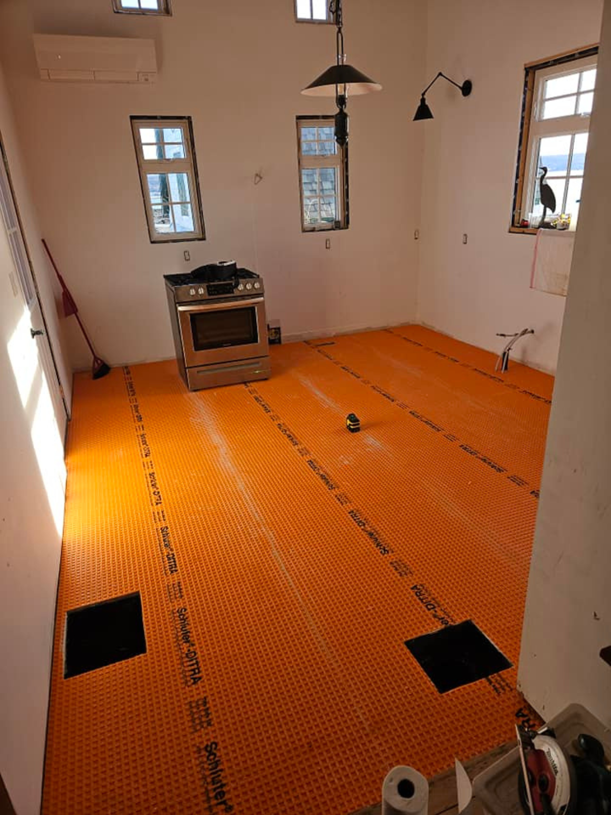 Subfloor installation, tile installation, cabinetry, and finishing touches.